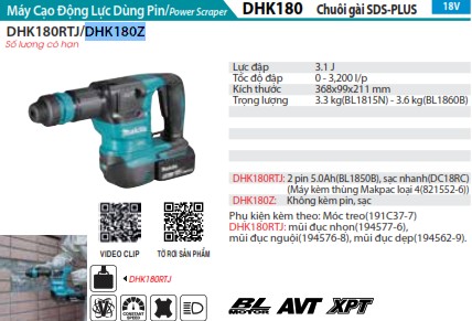 Máy Cạo Động Lực Dùng Pin(BL)(18V) – Makita DHK180Z sở hữu lực đập lên đến 3.1 J, cùng với tốc độ đập tối đa 3,200 lần/phút, giúp bạn dễ dàng xử lý các bề mặt cứng như bê tông, gạch hay kim loại. Máy được thiết kế với kích thước nhỏ gọn (368x99x211 mm) và trọng lượng khoảng 3.3 kg (với pin BL1815N) đến 3.6 kg (với pin BL1860B), mang đến sự linh hoạt và dễ dàng trong việc sử dụng.