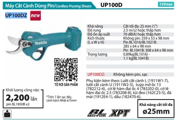 Giới thiệu sản phẩm MÁY CẮT CÀNH DÙNG PIN Makita UP100DZ (BL)(12V MAX)