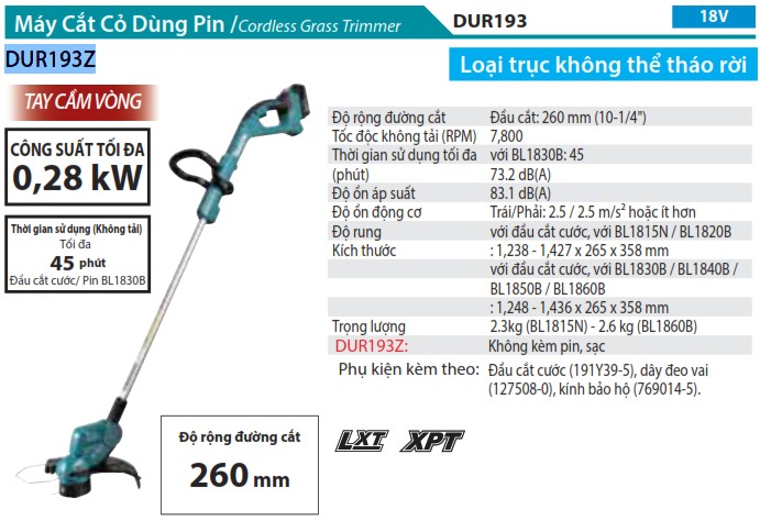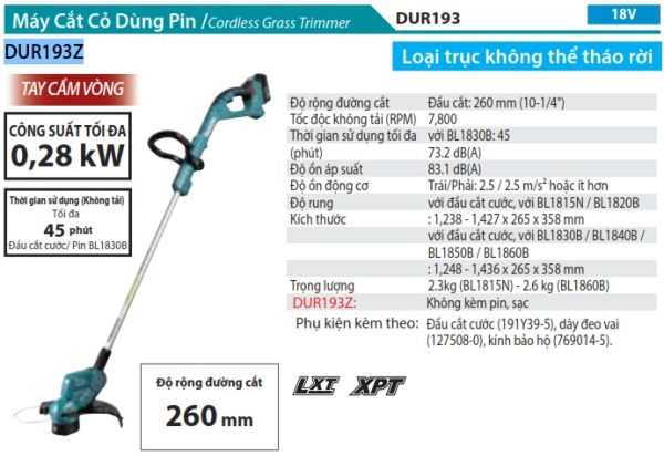 Makita DUR193Z được thiết kế với độ rộng cắt lên đến 260 mm, cho phép bạn xử lý cỏ dại một cách nhanh chóng và hiệu quả. Với trọng lượng chỉ khoảng 2.3 kg, máy rất nhẹ, giúp bạn dễ dàng thao tác mà không cảm thấy mệt mỏi. Đặc biệt, sản phẩm này sử dụng pin 18V, giúp bạn linh hoạt trong việc di chuyển mà không bị ràng buộc bởi dây điện.