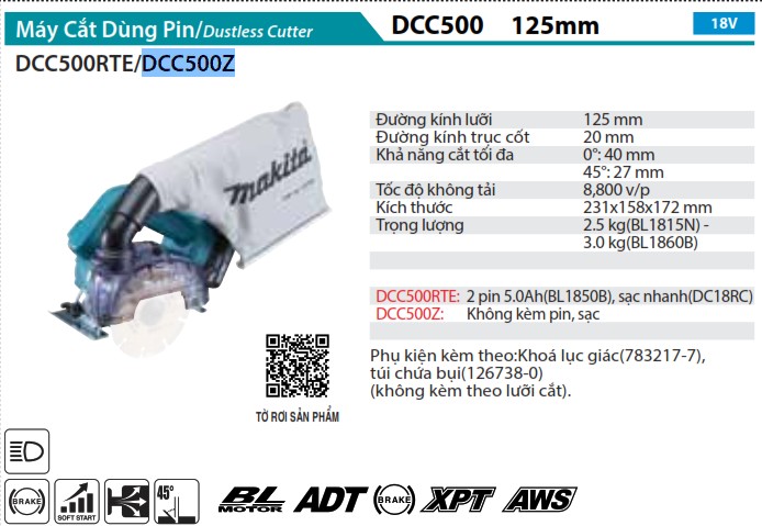 Vậy Makita DCC500Z mang lại những gì cho người sử dụng? Đầu tiên, máy có công suất tối đa lên đến 700 W, đảm bảo khả năng cắt mạnh mẽ cho nhiều loại vật liệu như gỗ, nhựa và kim loại. Đường kính lưỡi cắt là 125 mm, cho phép bạn thực hiện các đường cắt lớn và sâu một cách dễ dàng.