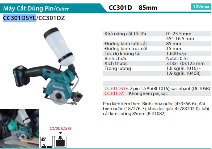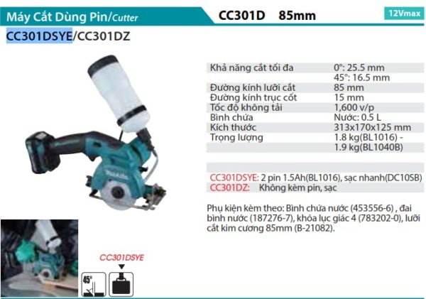 Máy Cắt Dùng Pin(12V MAX) (kèm 02 pin 1.5AH + sạc) - Makita CC301DSYE Gọi Ngay
