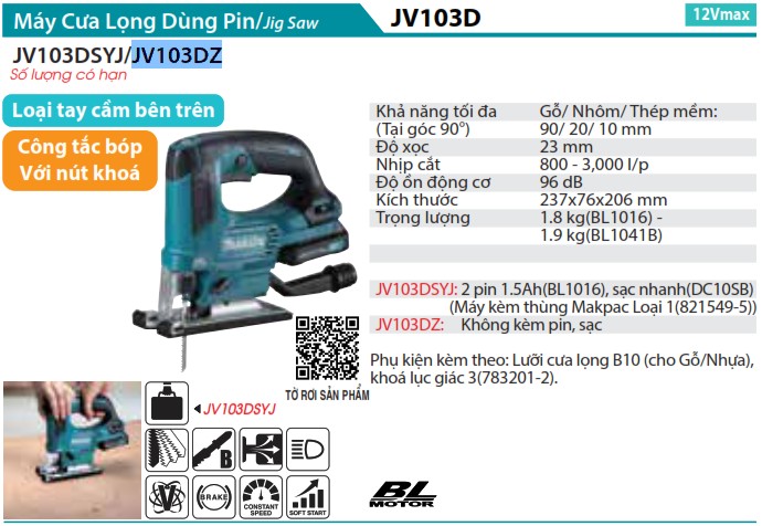 Máy cưa lọng dùng pin Makita JV103DZ (BL) (12V Max) Chat Zalo