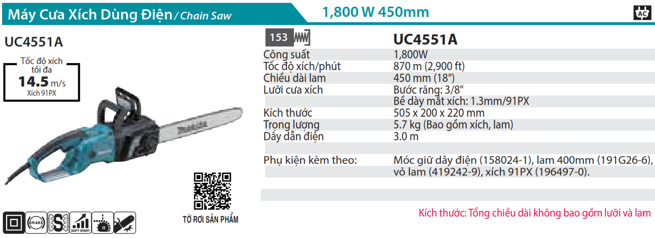 Giới thiệu sản phẩm MÁY CƯA XÍCH DÙNG ĐIỆN Makita UC4551A