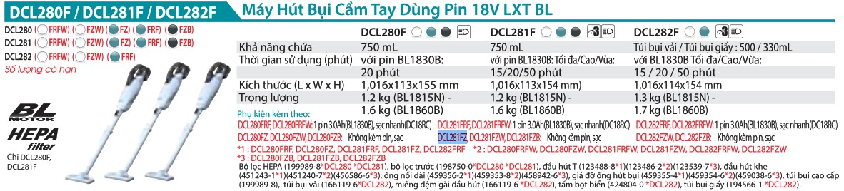 Máy Hút Bụi Dùng Pin(HEPA/BL)(18V) (không kèm pin sạc) - Makita DCL281FZ Gọi Ngay