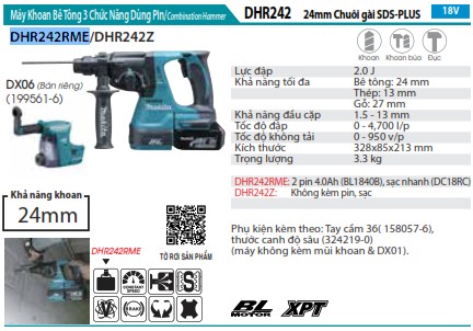 Chào các bạn! Hôm nay, mình muốn giới thiệu đến các bạn một sản phẩm tuyệt vời trong lĩnh vực khoan bê tông, đó chính là Máy Khoan Bê Tông 3 Chức Năng Dùng Pin (kèm 02 pin 4.0Ah + sạc nhanh) – Makita DHR242RME. Đây là một trong những mẫu máy khoan được yêu thích nhất đến từ thương hiệu Makita, nổi tiếng với chất lượng và hiệu suất vượt trội. Với thiết kế nhỏ gọn nhưng mạnh mẽ, sản phẩm này hứa hẹn sẽ giúp bạn hoàn thành mọi công việc một cách dễ dàng và hiệu quả.