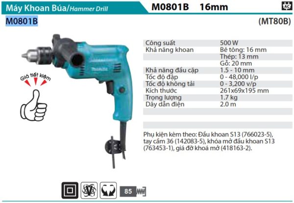 Với công suất 500W mạnh mẽ, Makita M0801B giúp bạn khoan, đục các vật liệu cứng một cách dễ dàng và nhanh chóng. Khả năng khoan bê tông lên đến 16mm, thép 13mm và gỗ 20mm cho phép máy ứng dụng trong nhiều công việc khác nhau. Tốc độ đập lên đến 43.500 lần/phút và tốc độ không tải 2.900 vòng/phút giúp bạn hoàn thành công việc một cách nhanh chóng và hiệu quả.