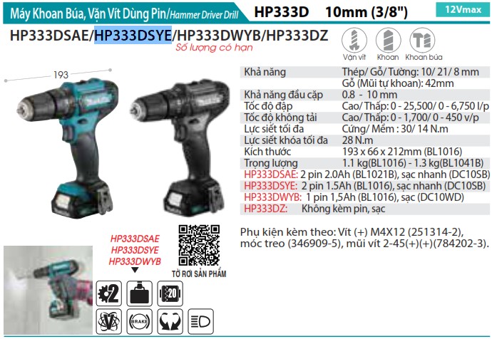 Tôi thấy khách hàng thường xuyên quay lại để mua thêm HP333DSYE Máy khoan búa và vặn vít dùng pin Makita Makita HP333DSYE này.