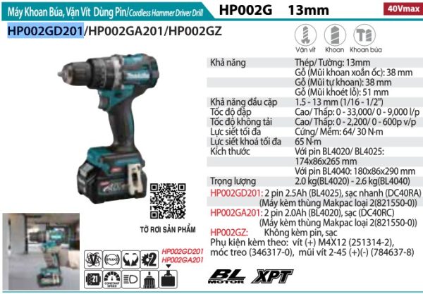 Chào các bạn! Hôm nay, mình muốn chia sẻ với các bạn một sản phẩm cực kỳ ấn tượng mà mình tin rằng sẽ là trợ thủ đắc lực trong mọi công việc khoan, vặn vít của bạn. Đó chính là Máy Khoan Búa Và Vặn Vít Dùng Pin (BL) (40) (kèm 02 pin 2.5 Ah + sạc) – Makita HP002GD201. Với thiết kế hiện đại, tính năng vượt trội và hiệu suất làm việc cao, sản phẩm này xứng đáng là một trong những lựa chọn hàng đầu cho những ai yêu thích công việc DIY hay những người làm trong ngành xây dựng, sửa chữa.