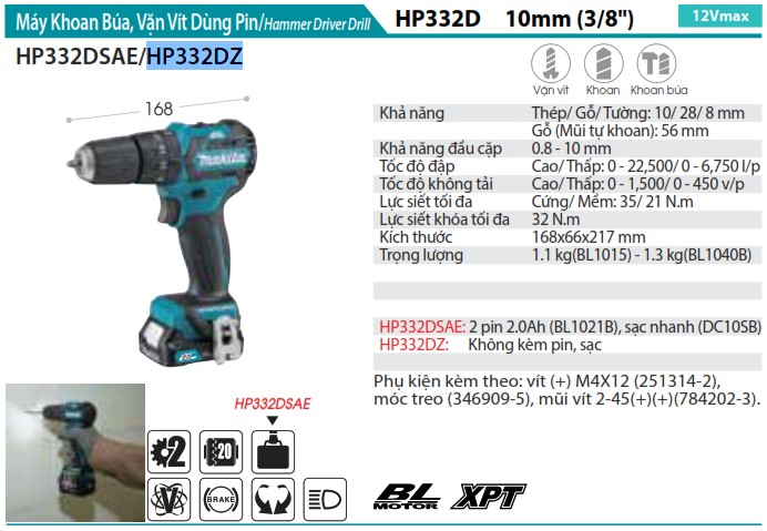 Nếu bạn đang tìm kiếm một chiếc máy khoan nhỏ gọn nhưng đầy sức mạnh, có thể khoan trên nhiều loại vật liệu khác nhau, thì Máy Khoan Búa, Vặn Vít Dùng Pin(BL) (không kèm pin sạc) – Makita HP332DZ chính là lựa chọn lý tưởng. Đây là sản phẩm với thiết kế thông minh, sử dụng động cơ không chổi than (BL) giúp máy hoạt động mạnh mẽ, bền bỉ và tiết kiệm năng lượng hơn. Đặc biệt, máy khoan này không kèm pin sạc, điều này cho phép người dùng linh hoạt lựa chọn các loại pin phù hợp với nhu cầu sử dụng của mình.