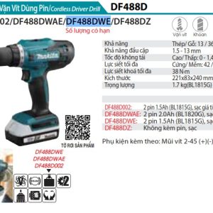 Máy Khoan Và Vặn Vít Dùng Pin(BL1815G*2+ (kèm 02 pin + sạc) – Makita DF488DWE