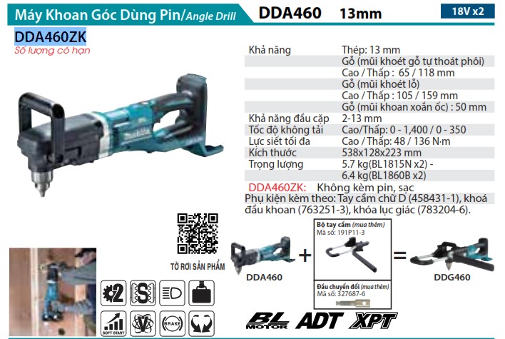 Công dụng và chức năng của Máy Khoan Góc Dùng Pin(BL)(18Vx2) (không kèm pin sạc) – Makita DDA460ZK