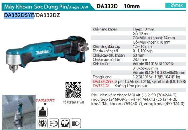 Công dụng và Chức năng của Máy Khoan Góc(12V MAX) (kèm 02 pin 1.5AH + sạc) – Makita DA332DSYE
