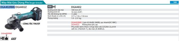 Máy Mài Góc Dùng Pin (kèm 02 pin 4.0Ah + sạc nhanh) - Makita DGA402RME