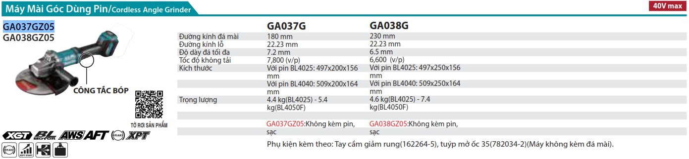 Công dụng và chức năng của Máy Mài Góc Dùng Pin (180MM/CÔNG TẮC BÓP) (không kèm pin sạc) – Makita GA037GZ05