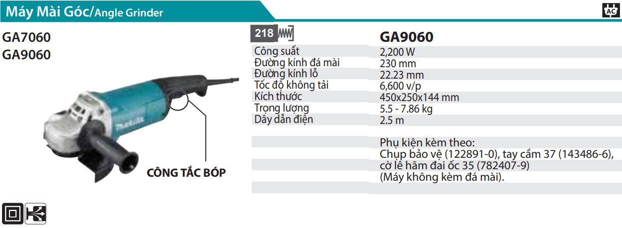 Máy Mài Góc(230MM/2200W/CÔNG TẮC BÓP) - Makita GA9060