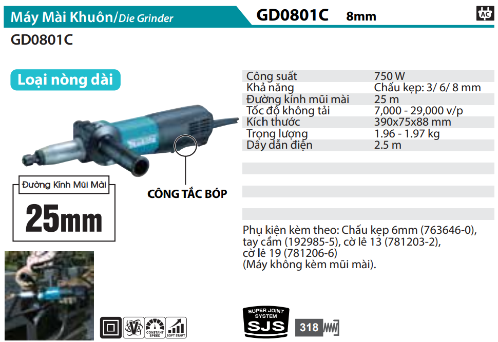Máy Mài Khuôn (8MM) – Makita GD0801C sở hữu công suất lên đến 750W, đủ sức để thực hiện các công việc mài mòn và hoàn thiện một cách nhanh chóng và hiệu quả. Điều đặc biệt là máy có khả năng sử dụng chấu bóp với kích thước 3, 6 và 8 mm, cho phép người dùng dễ dàng thay đổi các mũi mài khác nhau tùy theo nhu cầu công việc.