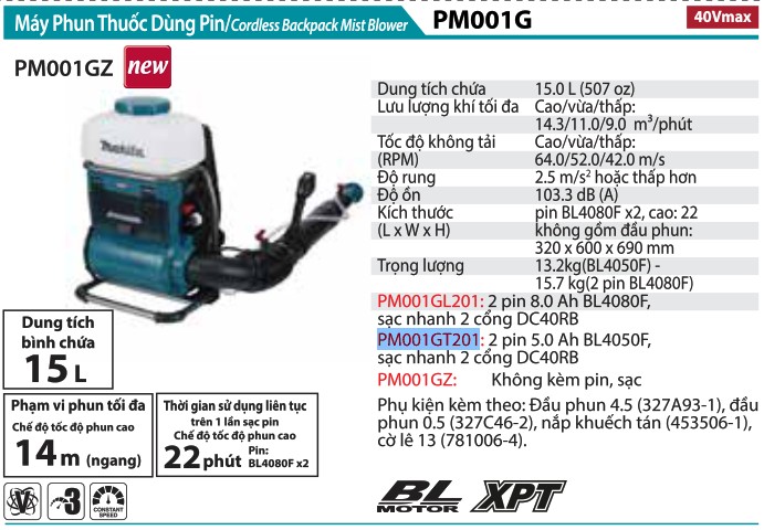 MÁY PHUN THUỐC DÙNG PIN Makita  PM001GT201 (BL)(40V MAXX2) Chat Zalo