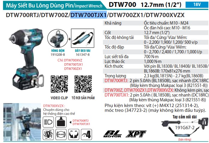 Chào các bạn! Hôm nay, mình rất vui được giới thiệu đến các bạn một sản phẩm cực kỳ chất lượng trong dòng máy siết bu lông: Máy Siết Bu Lông Dùng Pin (12.7MM) (kèm 02 pin 5.0 + sạc nhanh) – Makita DTW700TJX1. Với thiết kế thông minh và hiệu suất ấn tượng, sản phẩm này là sự lựa chọn tuyệt vời cho những ai thường xuyên thực hiện các công việc liên quan đến sửa chữa và lắp ráp.