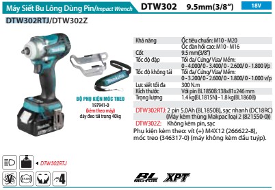 Máy Siết Bu Lông Dùng Pin(9.5MM/ (kèm 02 pin 5.0 + sạc nhanh) – Makita DTW302RTJ này có khả năng hoạt động mạnh mẽ trên mọi loại vật liệu.