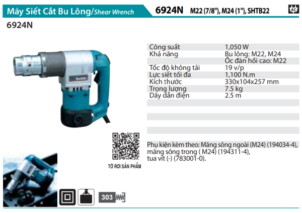 Máy Siết Cắt Bu Lông – Makita 6924N được thiết kế đặc biệt để siết chặt và cắt bu lông, đặc biệt là với các loại bu lông M22 và M24. Không chỉ là một công cụ siết bu lông thông thường, máy còn có khả năng làm việc với ốc đàn hồi cao, giúp bạn dễ dàng thực hiện các công việc yêu cầu lực siết lớn.