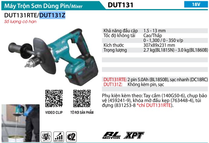 Máy Trộn Sơn Dùng Pin(BL)(18V) (không kèm pin sạc) - Makita DUT131Z Gọi Ngay