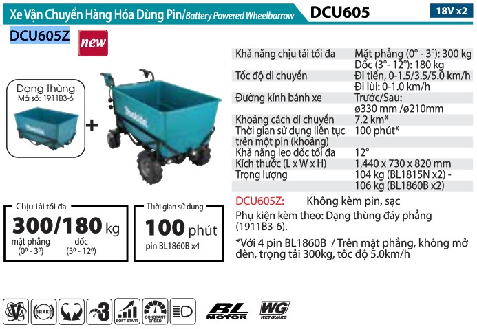 Công dụng và chức năng của Xe Vận Chuyển Hàng Hóa Dùng Pin (DẠNG THÙNG ĐẾ BẰNG/BL)(18VX2) – Makita DCU605Z